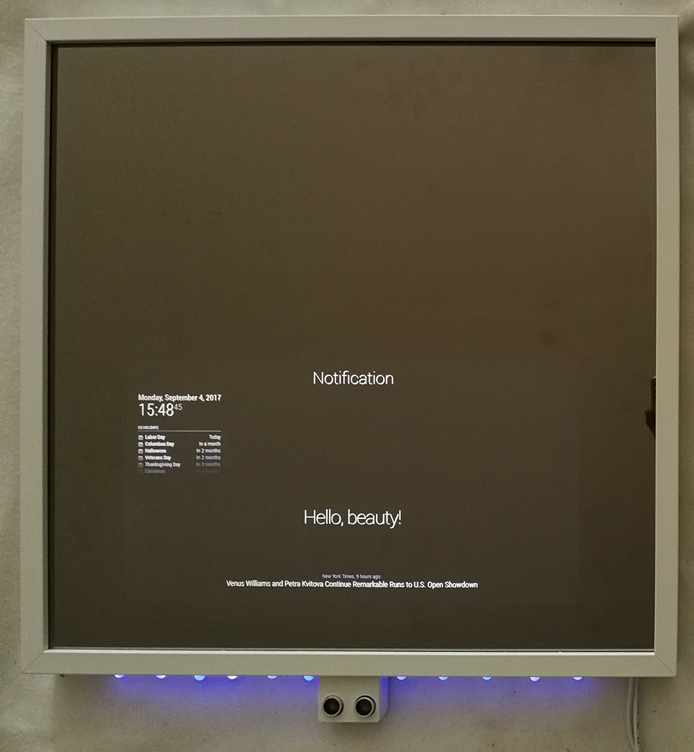 Some small push buttons on the top of the frame are used to toggle MagicMirror modules and shutdown the mirror.